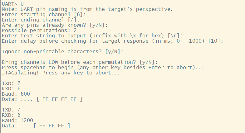 显然JTAGulator的优点就是非常方便,只需要测出GND然后其他随便连接在接口上就可以了开始测试了