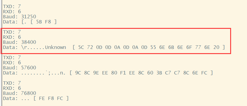 在输出的结果里面可以看到当7号接口(路由器的左3)为TX,6号接口(路由器的左2)为RX,并且波特率为38400的时候可以输出有意义的字符串 Unknown