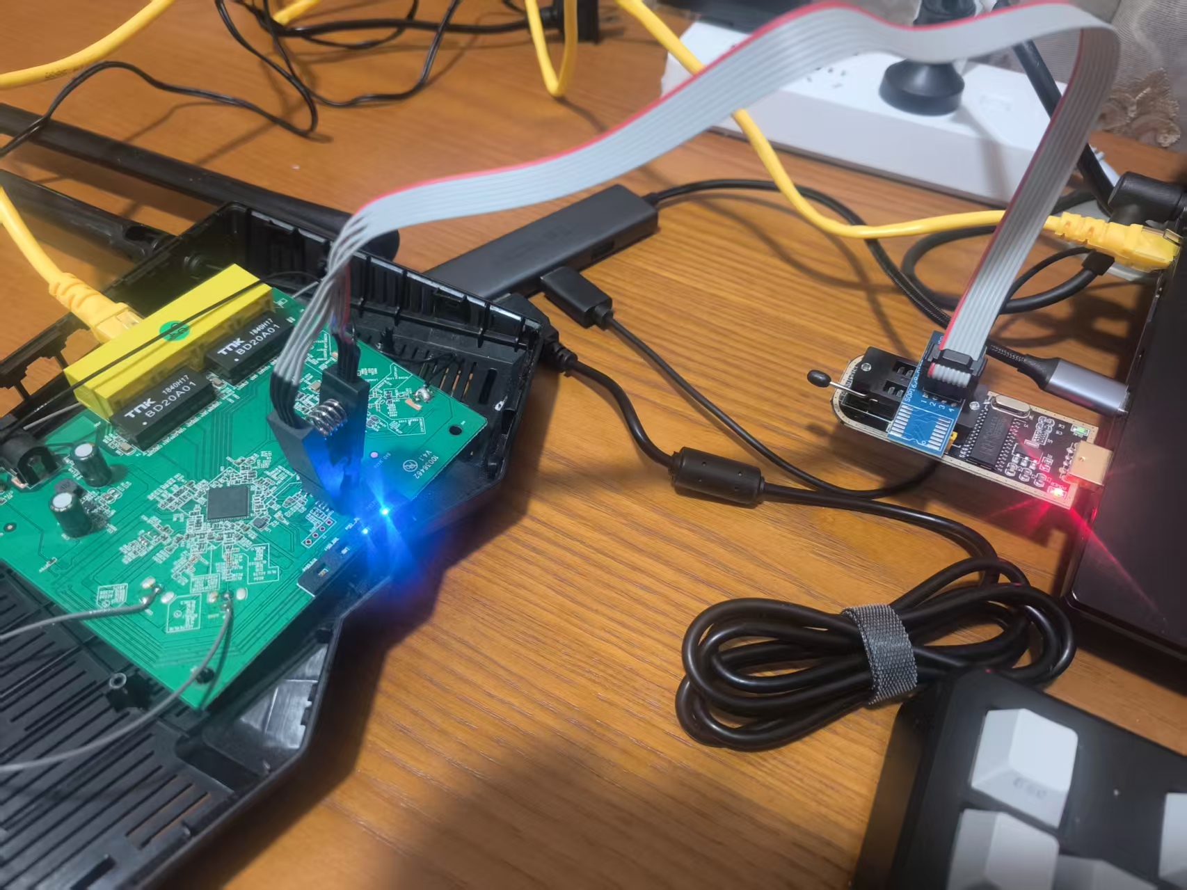 之后使用适配电源对路由器PCB板进行通电