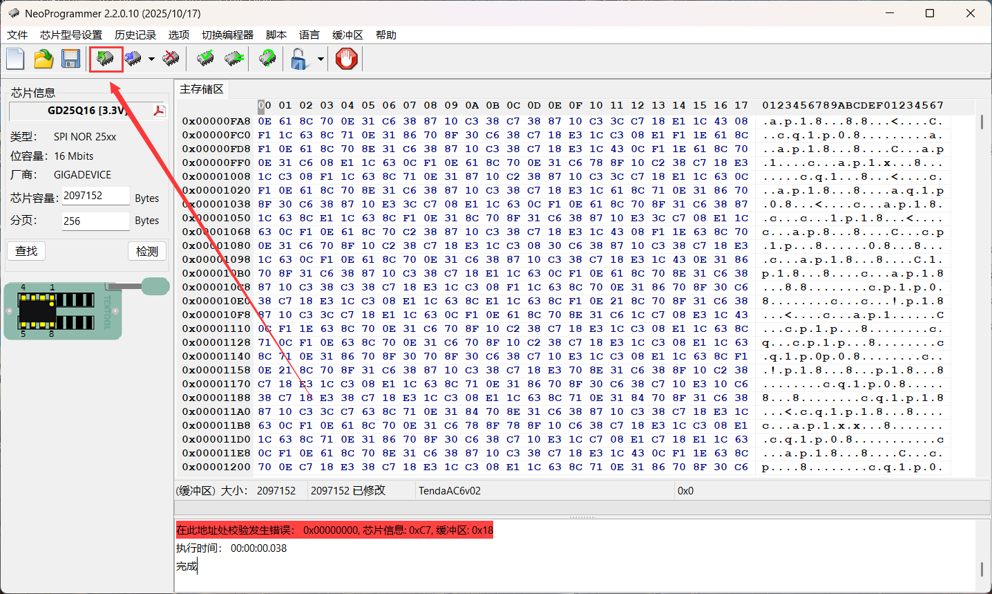 将红线对着芯片右下角那个圆的位置夹住,然后CH341A插入电脑打开软件分辨芯片型号并进行拷贝