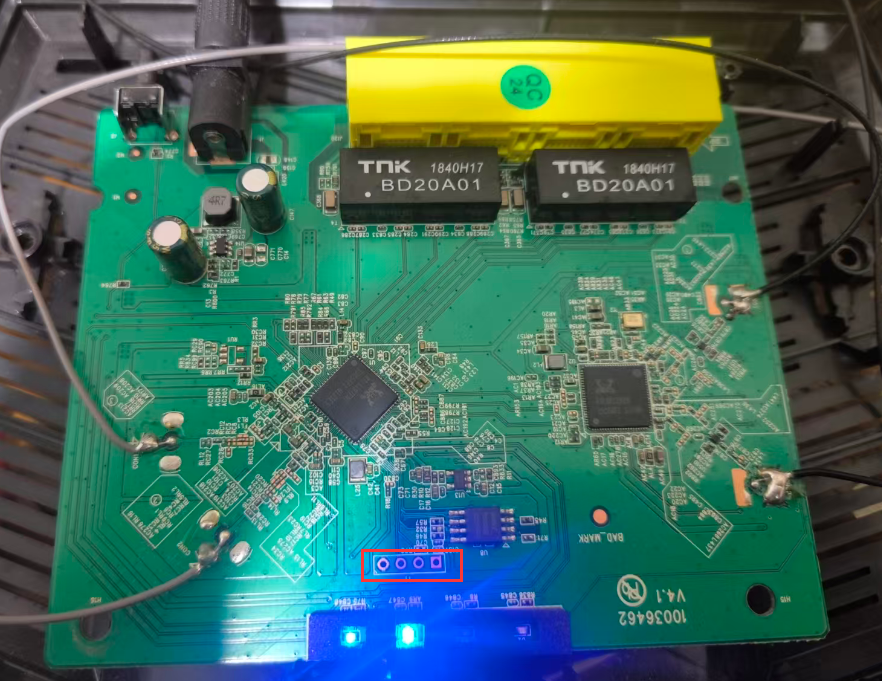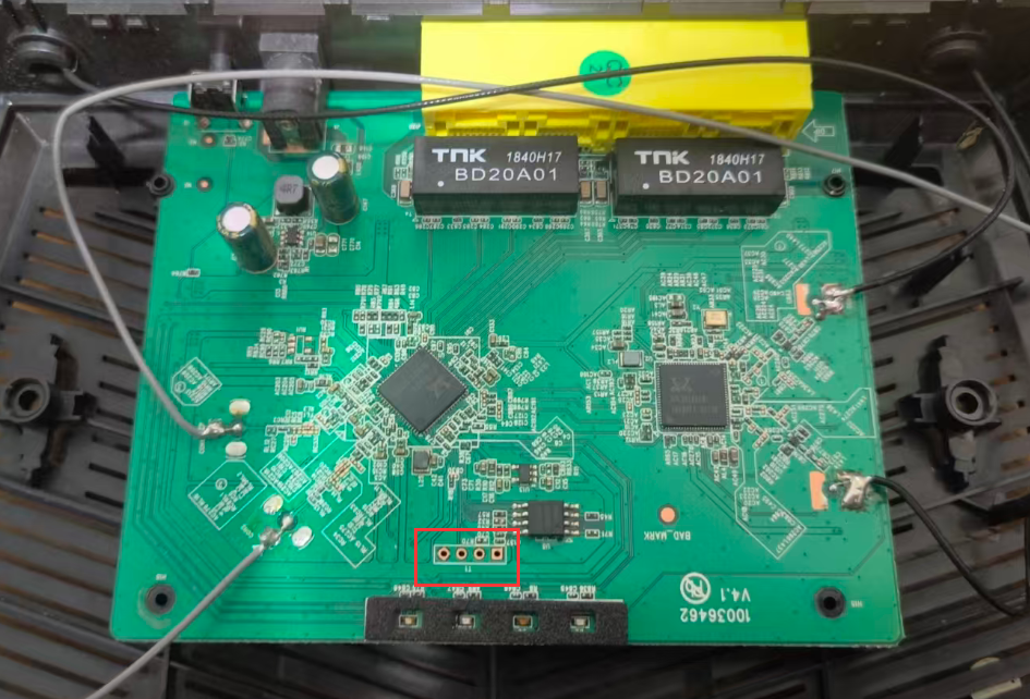 拆开Tenda AC6在下方可以看到四个连在一起的孔就是我们的UART口