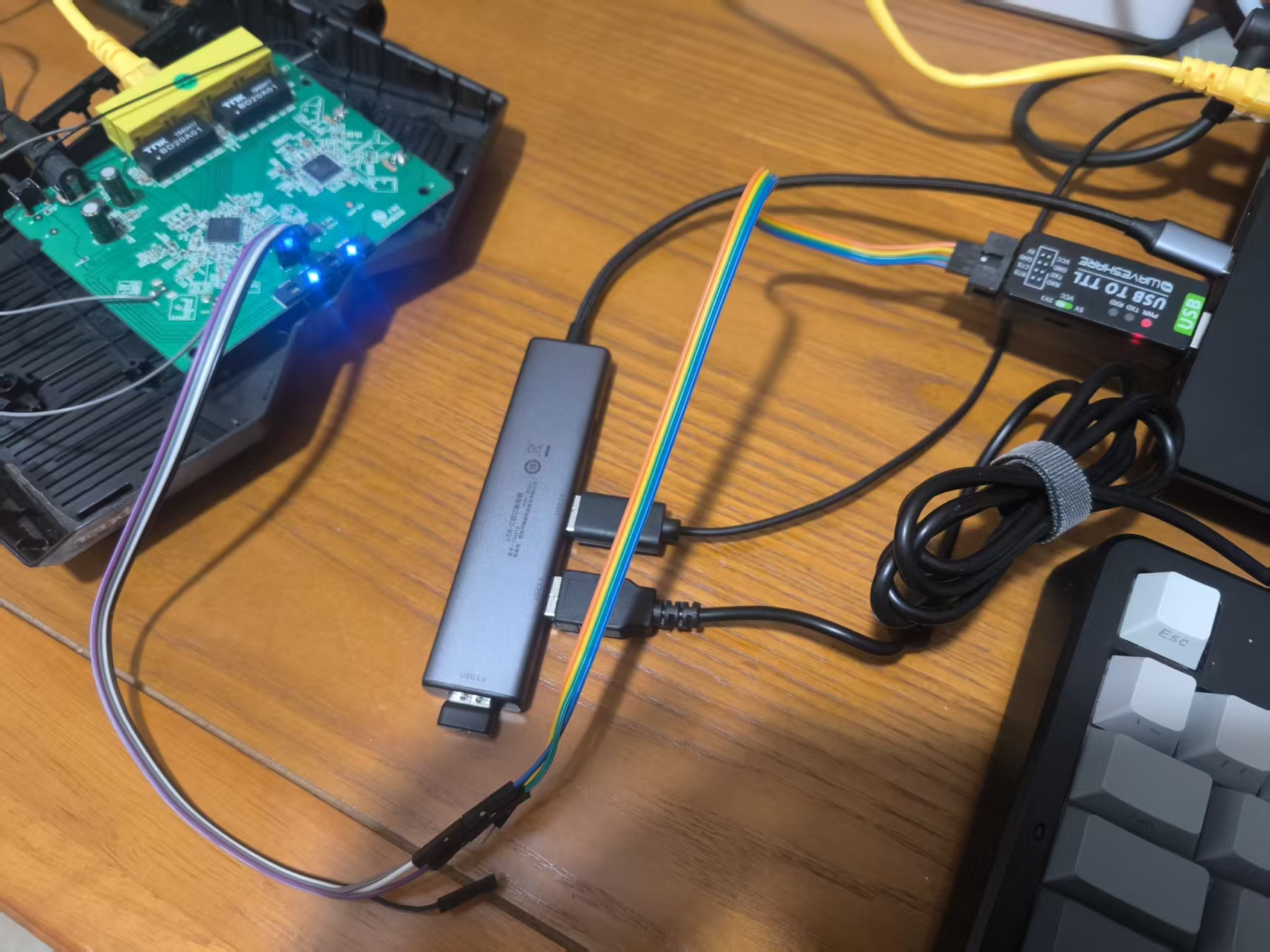 注意USB to TTL的TX应该要接在路由器的RX上,也就是左2,那么USB to TTL的RX就要接在左3上,然后GND对应GND,VCC不需要连接,具体如下所示(笔者没有焊接,直接使用杜邦线连接,只要插得紧和焊接效果应该是一样,如果插不紧那就只能焊接一下了)
