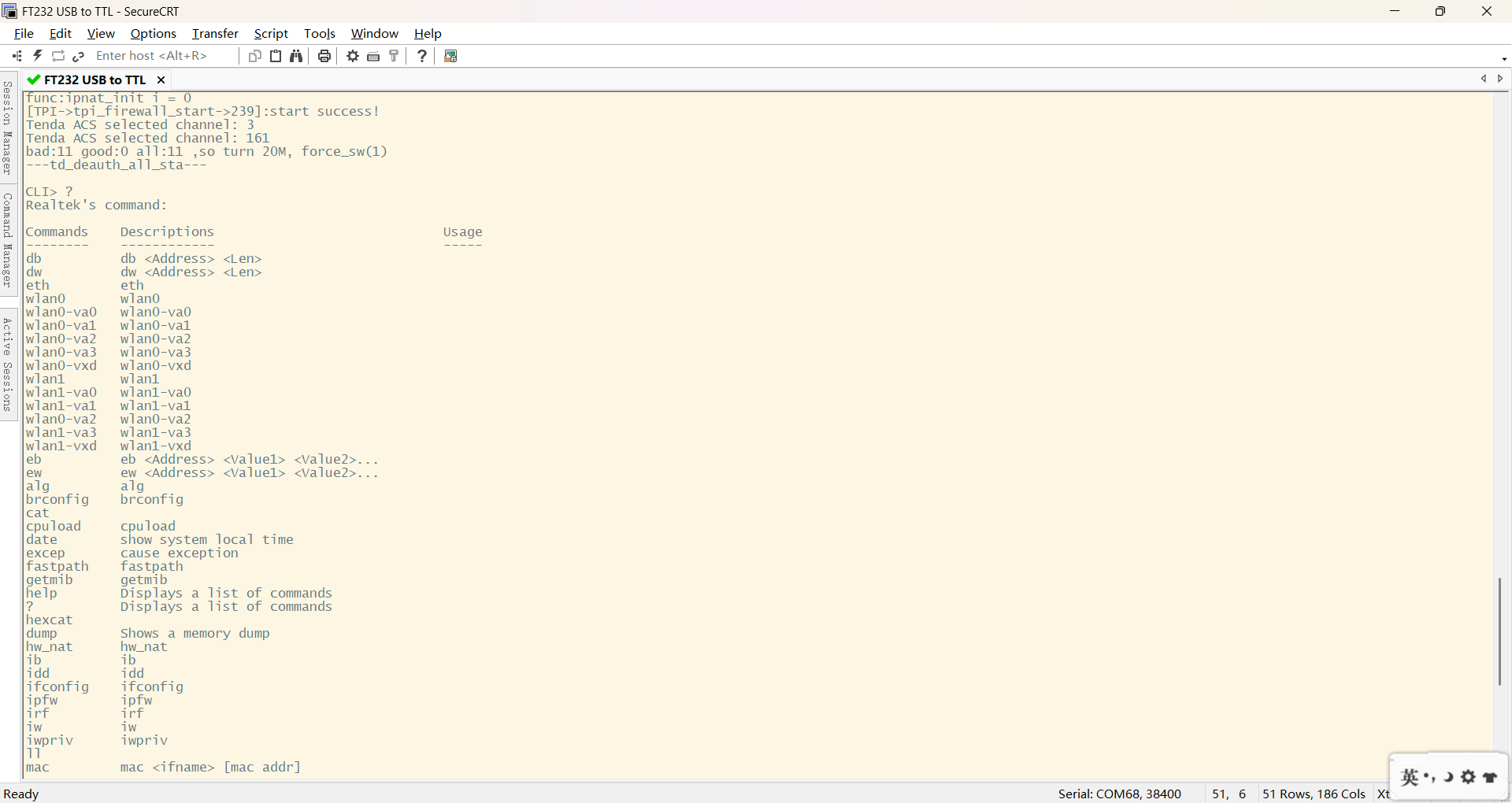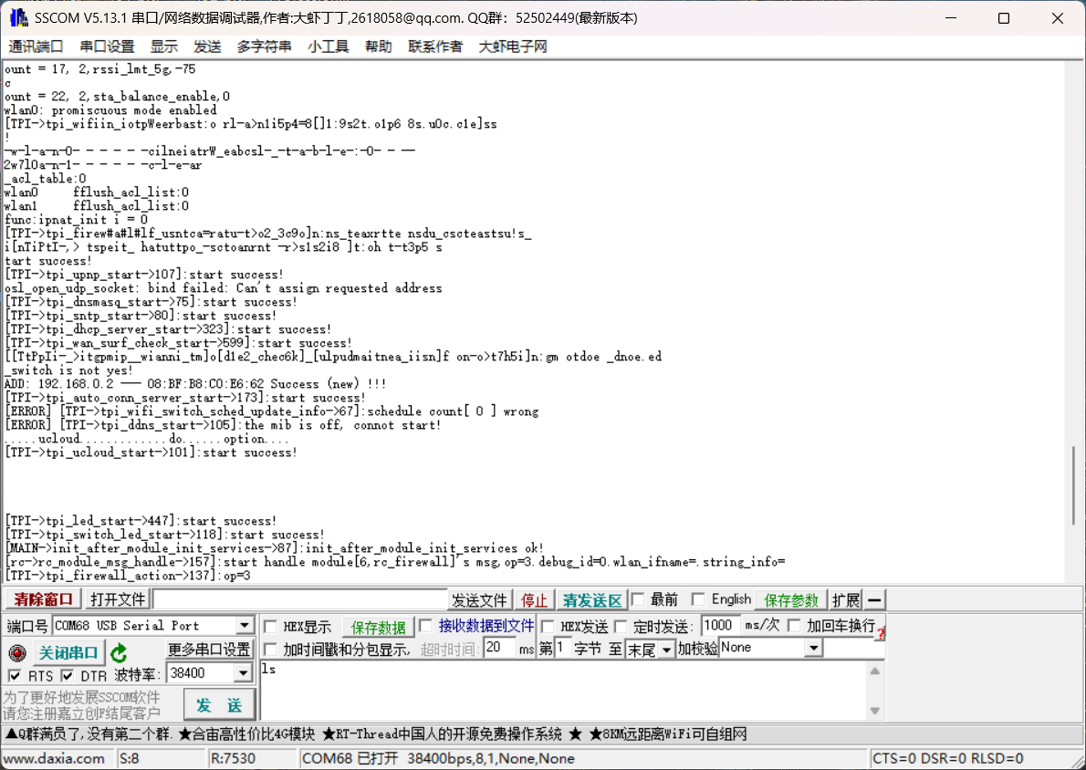 然后使用SSCOM软件进行连接,这里多次实验后得知笔者手头这款Tenda AC6路由器的波特率是 38400